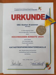 Im Rahmen der Übergaben der Schutzbekleidung beim Bildungszentrum Magdalensberg durch BGM und LTPräs. Andreas Scherwitzl wurden auch die Hochwassermedaillen des Niederösterreichischen Landesfeuerwehrverbandes für jene Kameraden, die beim Hochwassereinsatz in NÖ 2024 seitens der Marktgemeinde Magdalensberg in Kirchberg an der Pielach (NÖ, Bezirk St.Pölten-Land) dabei waren, übergeben. Dies waren seitens der FF Pischeldorf OBI Gottfried Duller, BI Eckart Roland, OFM Manuel Klees, HFM Oberraufner Christian, LM Daniel Strauß, OFM Benjamin Hasler, HFM Erwin Pink, OFM Ewald Riepl, OFM Roland Zunk, seitens der FF Ottmanach BI Florian Scherwitzl, Mario Brunner und Florian Otto und seitens der FF St.Thomas am Zeiselberg OBI Stefan Krammer. BGM Andreas Scherwitzl dankte den Kameraden für ihr überregionales Engagement.