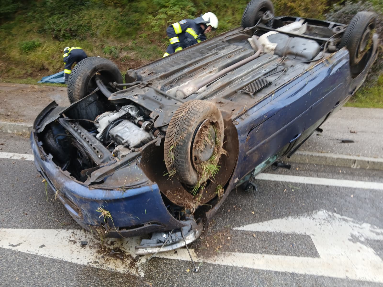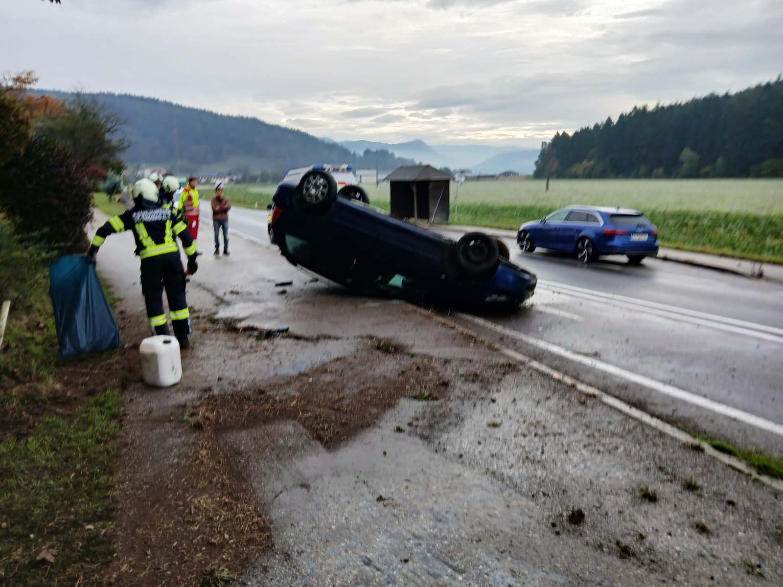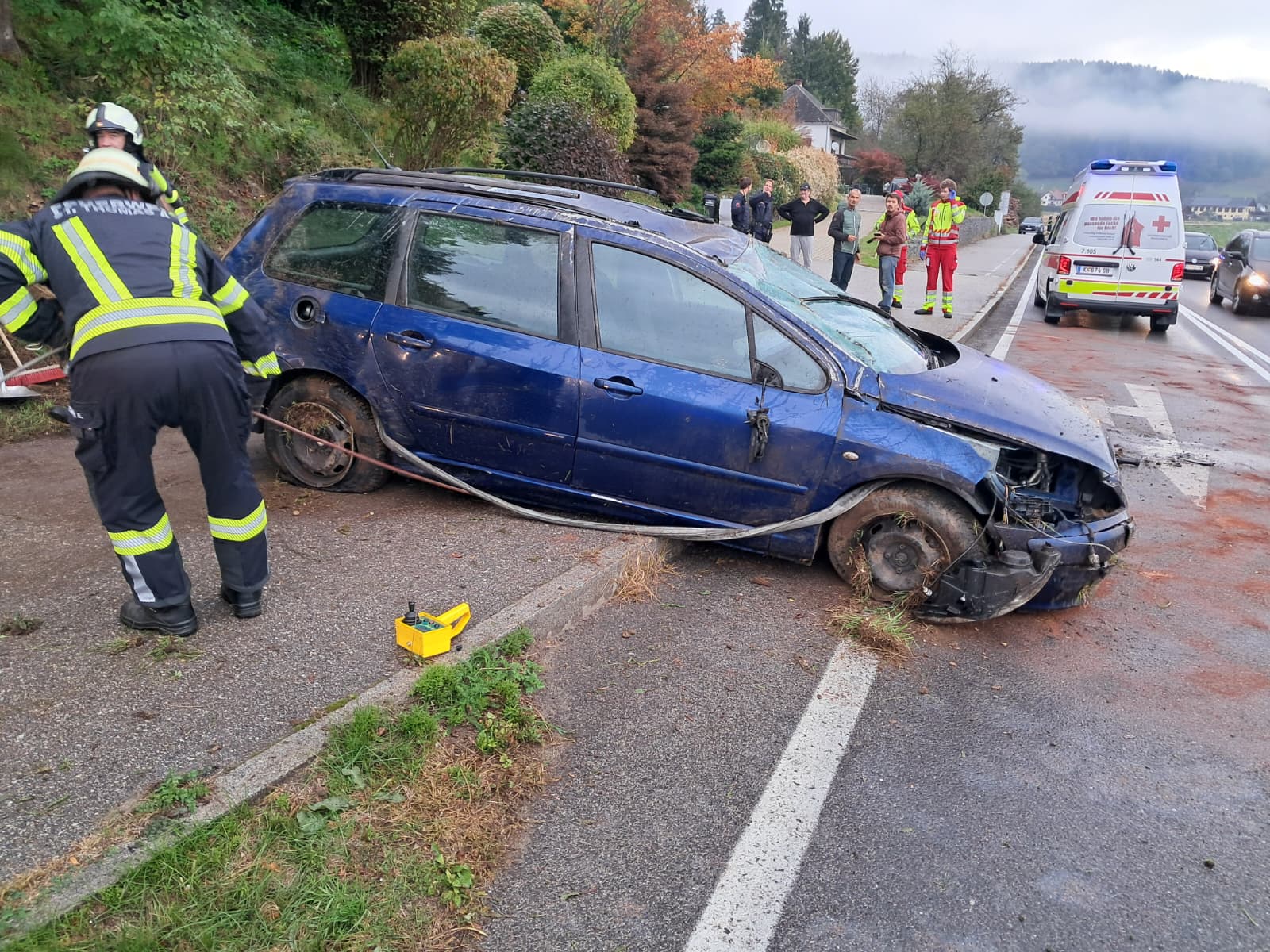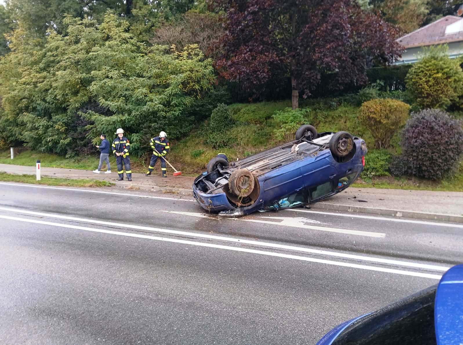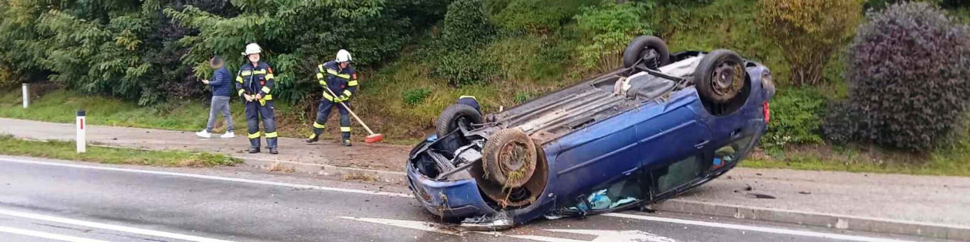 Ein PKW-Lenker verlor vermutlich nach einem Reifenplatzer die Kontrolle über sein Fahrzeug, prallte gegen die Gehsteigkante und schließlich an die Böschung. Dabei überschlug sich das Fahrzeug und kam am Dach liegend auf der Fahrbahn zu stehen. Der leicht verletzte Lenker konnte das Fahrzeug aus eigener Kraft verlassen und wurde von der Mannschaft einem zufällig vorbei fahrenden Rot-Kreuz-Fahrzeuges erst versorgt. Der leicht verletzte Lenker wurde in weiterer Folge in das UKH Klagenfurt eingeliefert. Die FF St.Thomas unterstützte die Streife der Polizeiinspektion Grafenstein bei der Verkehrsregelung, bindete das ausgeflossene Motoröl und reinigte die verschmutzte Fahrbahn. Mittels der Seilwinde des Löschfahrzeuges wurde das Fahrzeugwrack auf die Räder gestellt und von der Fahrbahn gezogen, um den Verkehrsfluss wieder zu gewährleisten. Anschließend wurde der anrückende Abschleppdienst bei der Verladung des Wracks unterstützt. Nach circa eineinhalb Stunden konnte die Feuerwehr wieder einrücken und die Einsatzbereitschaft wiederherstellen.