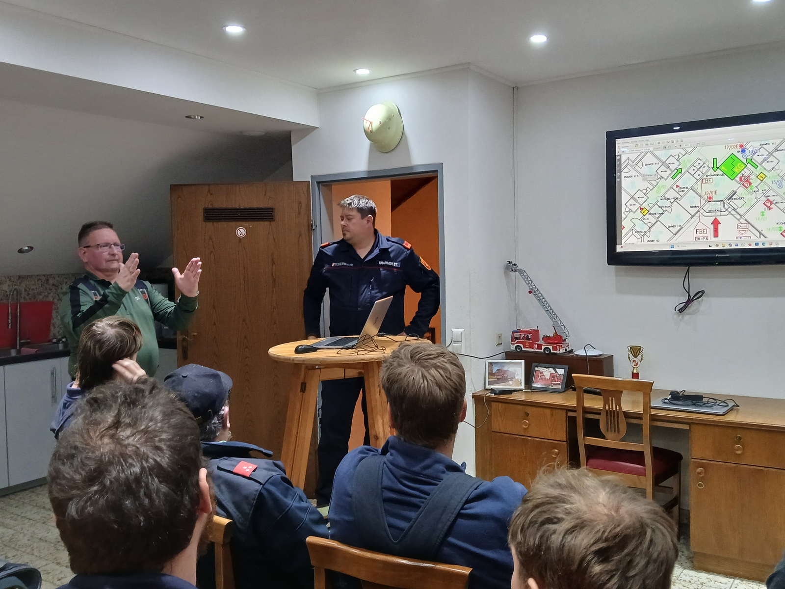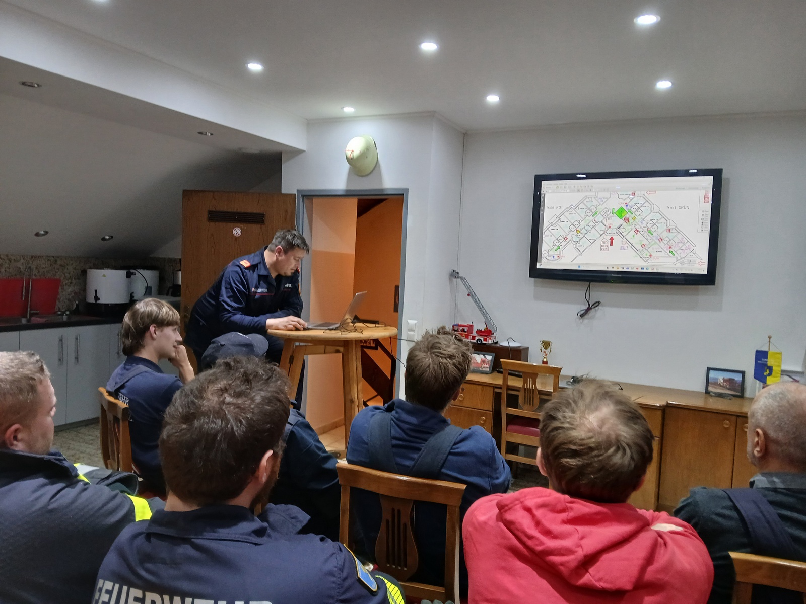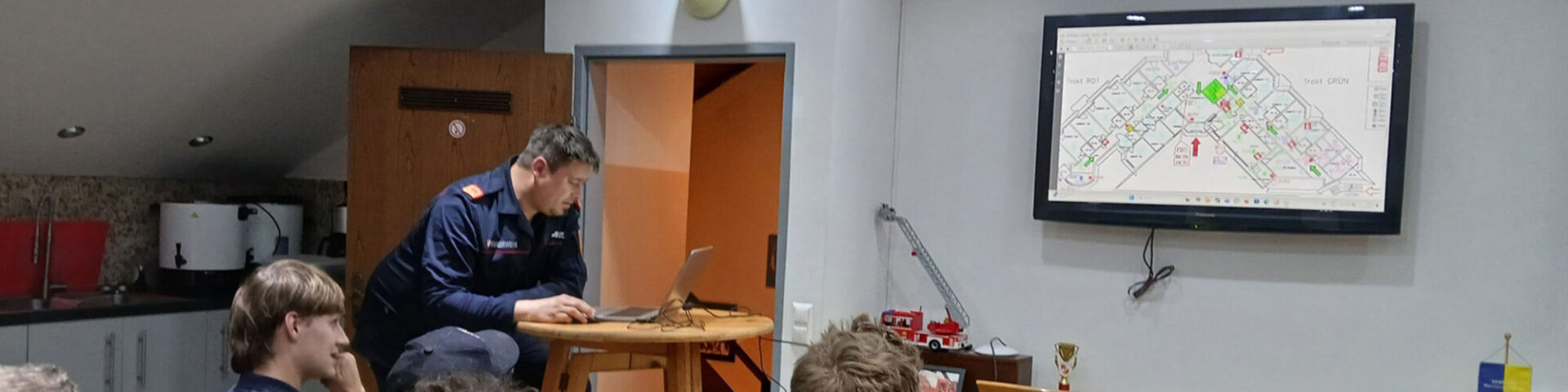Im Schulungs- und Kameradschaftsraum im Rüsthaus wurde beim ersten Teil der Übung eine kurze Schulung durchgeführt, der Brandschutzplan des Pflegeheimes „MAVIDA Magdalensberg“ theoretisch erörtert und wichtige Neuigkeiten, wie etwa die regen Bautätigkeit im in unserem Pflichtbereich, an die Kameraden weitergegeben. Weiters wurden die Herausforderungen im Zusammenhang mit der bevorstehenden Sanierung des Autobahnteilstückes zwischen Klagenfurt-Ost und Grafenstein erklärt und zur der Mannschaft Kenntnis gebracht. Weiters wurden die Fahrzeuge winterfit und die Fahrzeugboxen winterfit gemacht.
