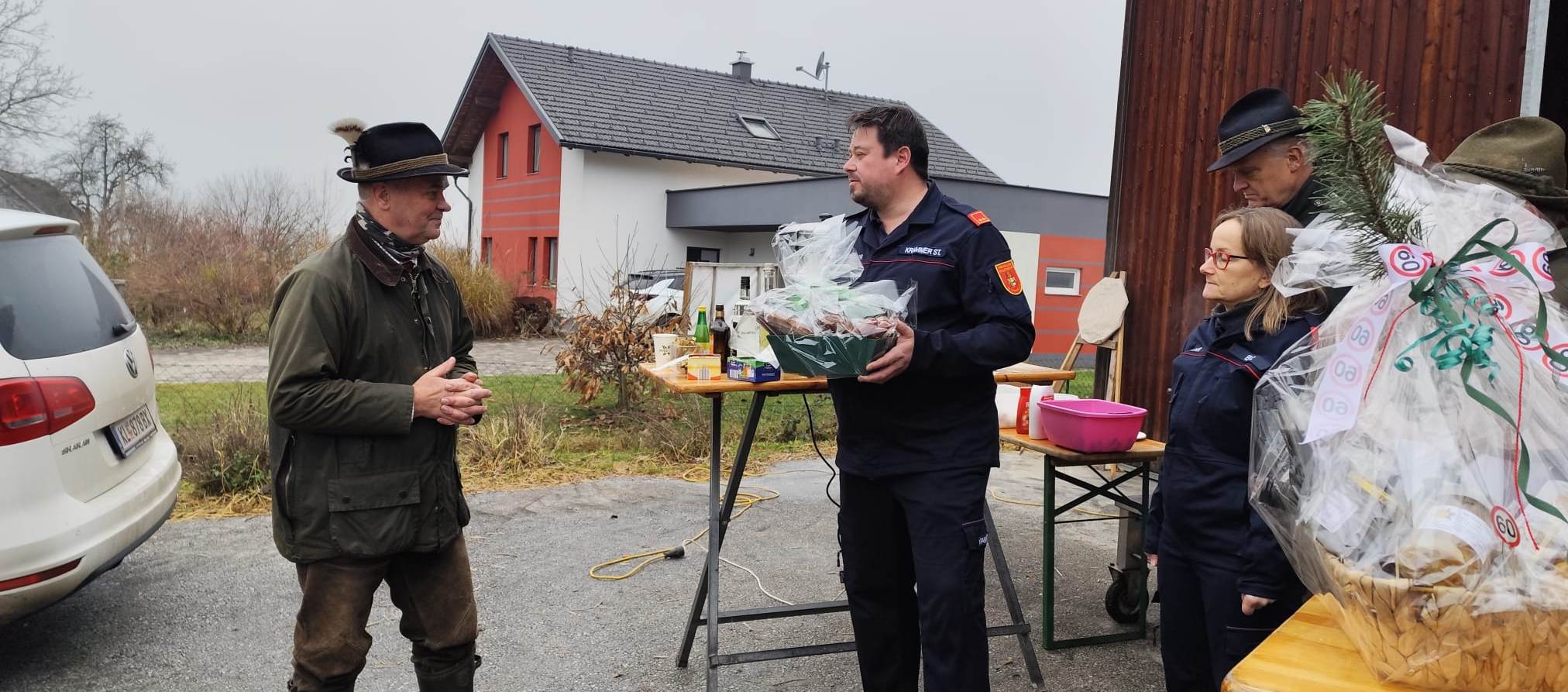 Anlässlich des runden Geburtstages unseres Jagd-Obmannes Ferdinand Pirmann lud dieser zu einer Treibjagd in unserem Jagdgebiet ein. Aus diesem Anlass durften wir seitens der Feuerwehr St.Thomas im Rahmen einer Feier dem Jubilar ein Präsent überreichen und der Jagdgemeinschaft St.Thomas für ihre Zusammenarbeit mit der Feuerwehr danken.