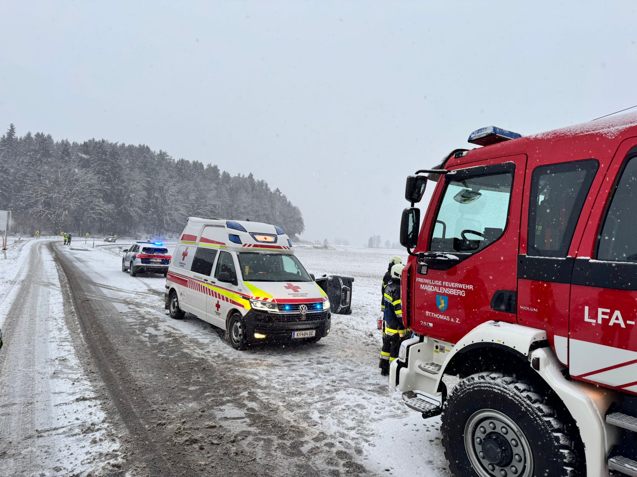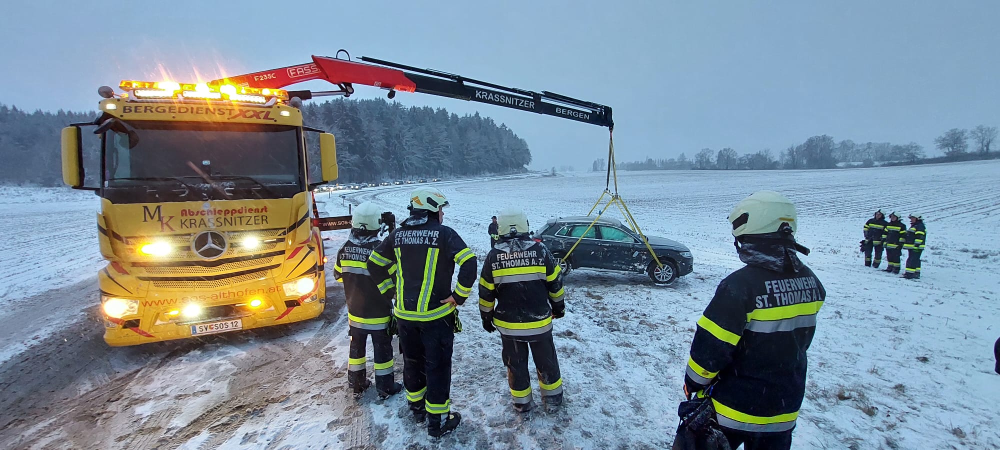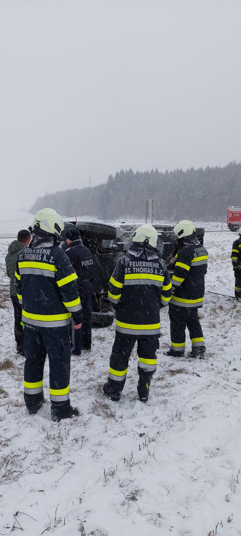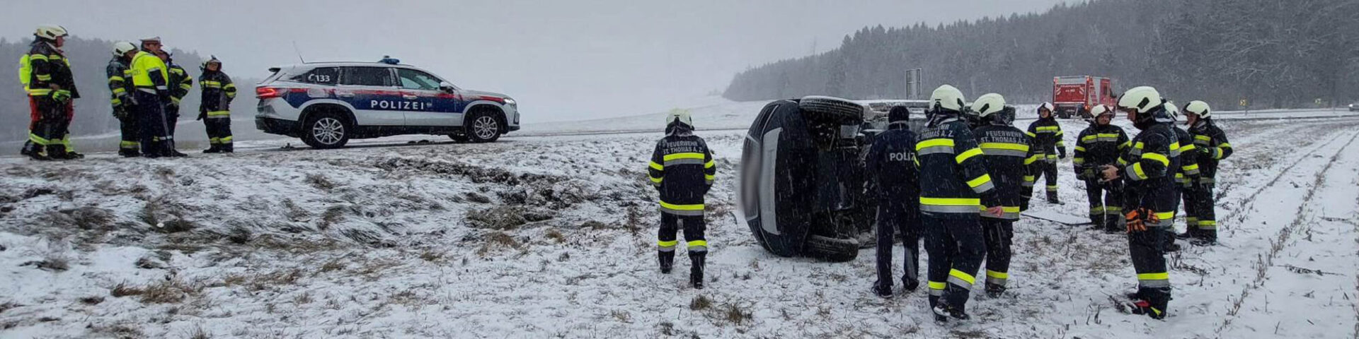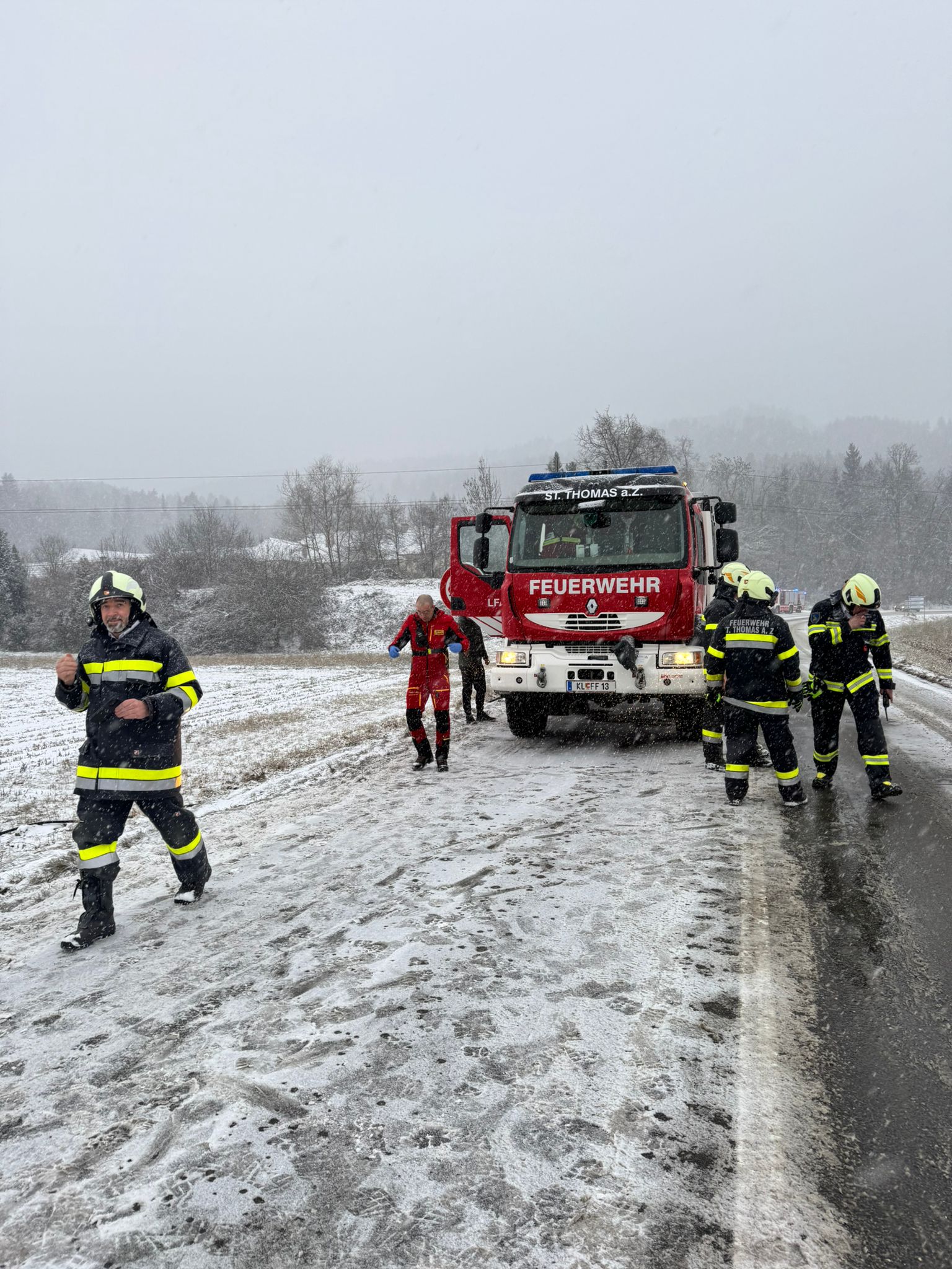 Auf der Görtschitztal Straße (B92) im Bereich der Ortschaft Gundersdorf kam ein Fahrzeuglenker mit seinem, mit drei Personenbesetzten PKW, von der Straße ab, überschlug sich mehrmals und kam seitlich im Acker zu liegen. Zwei Ersthelfer konnten den Personen aus dem Fahrzeug helfen, beim Eintreffen des LFAW der FF St.Thomas waren alle drei Insassen bereits aus dem Fahrzeug heraußen. Die anrückenden Feuerwehren konnten somit wieder abrücken, die FF St.Thomas übernahm die Arbeiten bis zur Freigabe der B92. Die Verunfallten wurden im Inneren unseres Löschfahrzeuges aufgewärmt, mit Getränken versorgt und vom anwesenden First Responder betreut. Der ebenfalls alarmierte Rettungshubschrauber konnte nach Kontrolle des Notarztes abrücken, zwei Personen wurden mit leichten Verletzungen vom Roten Kreuz ins Krankenhaus eingeliefert. Nach dem Abtransport des Fahrzeuges durch ein Abschleppunternehmen und die Säuberung der Fahrbahn durch die Straßenverwaltung (Schnee) konnte die FF St.Thomas nach circa 2 Stunden wieder ins Rüsthaus einrücken.