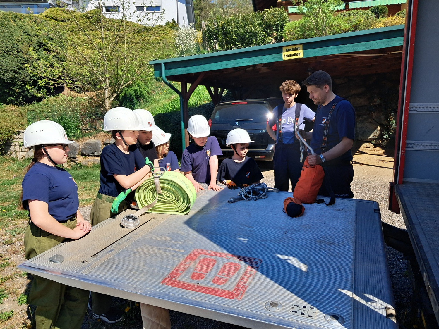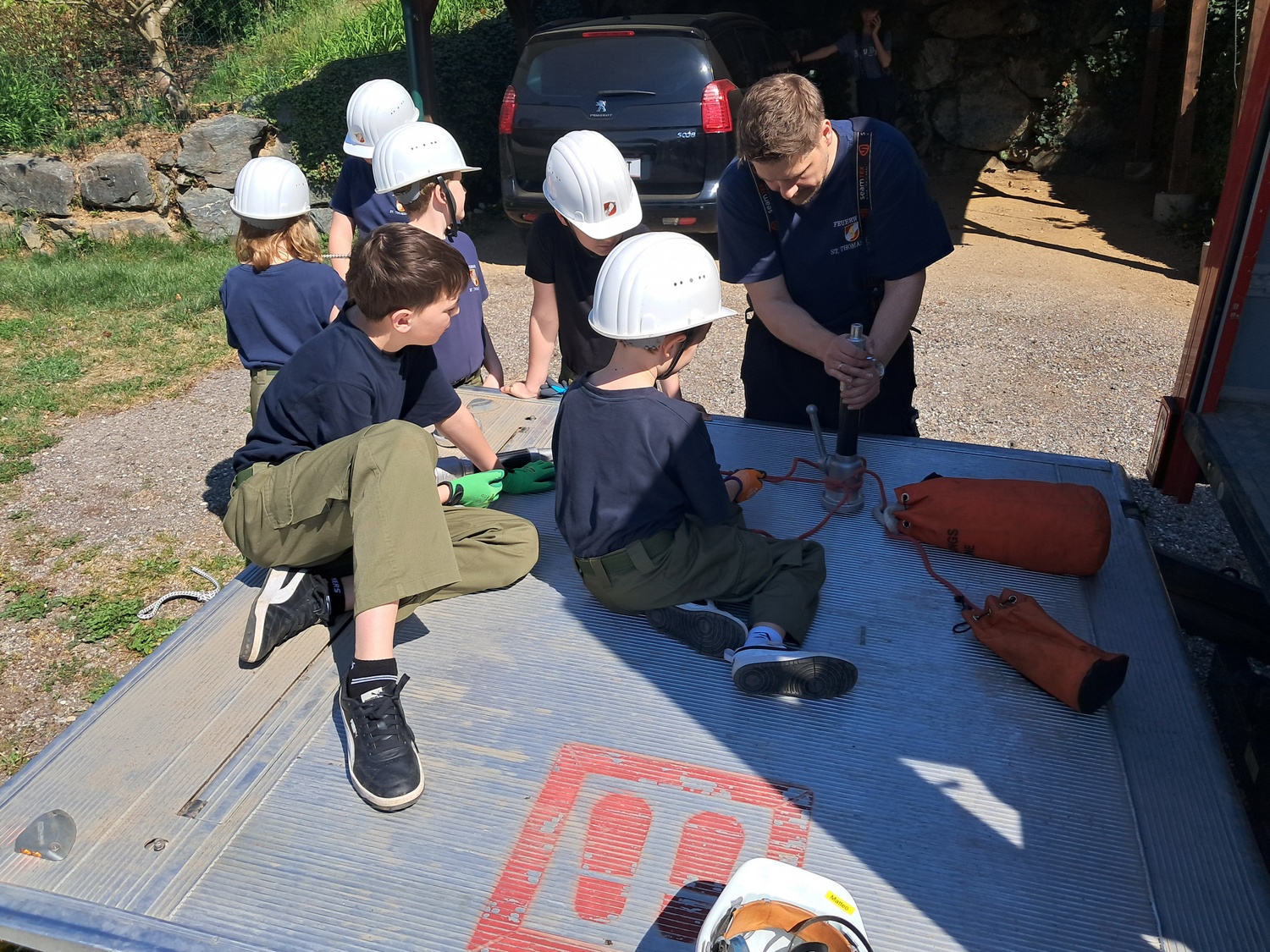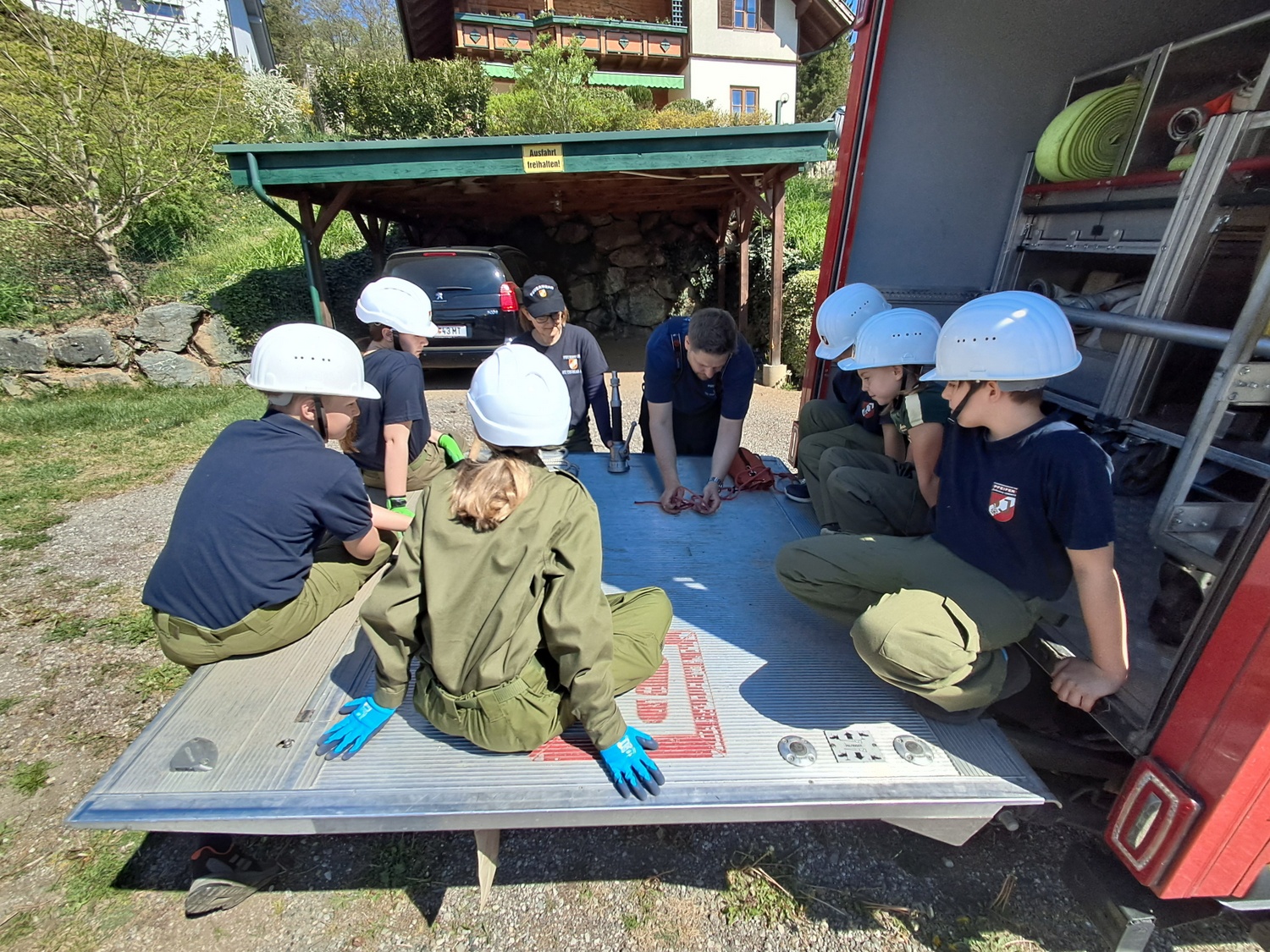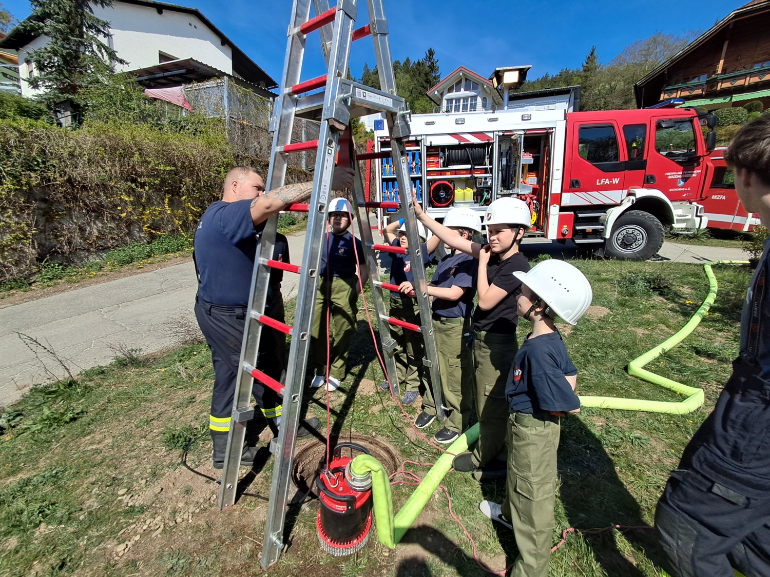 Im Anschluss an diese Besprechung wurde ein Teil der Theorie aus den Lernunterlegen der Wissenstests durchgenommen. Im Praxisteil der Übung wurde mit den Jugendlichen das Exerzieren geübt, nach einem kurzen Marsch zu unserem Orts-Wasserbassin wurde den Jugendlichen nach einer Gruppenteilung die Knotenkunde und die Bedienung der Tauchpumpe näher gebracht.