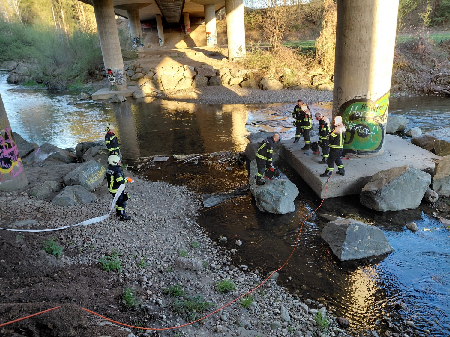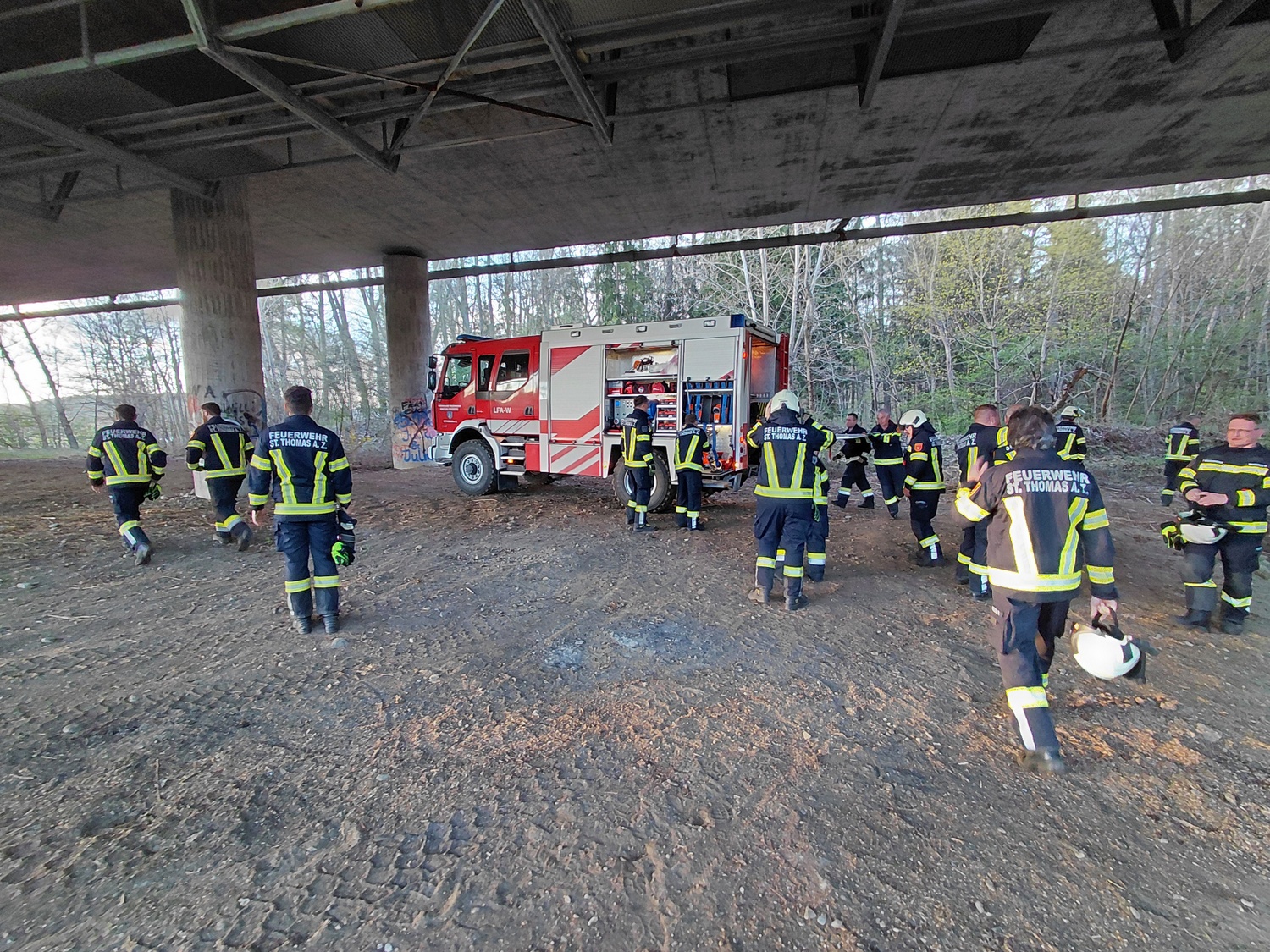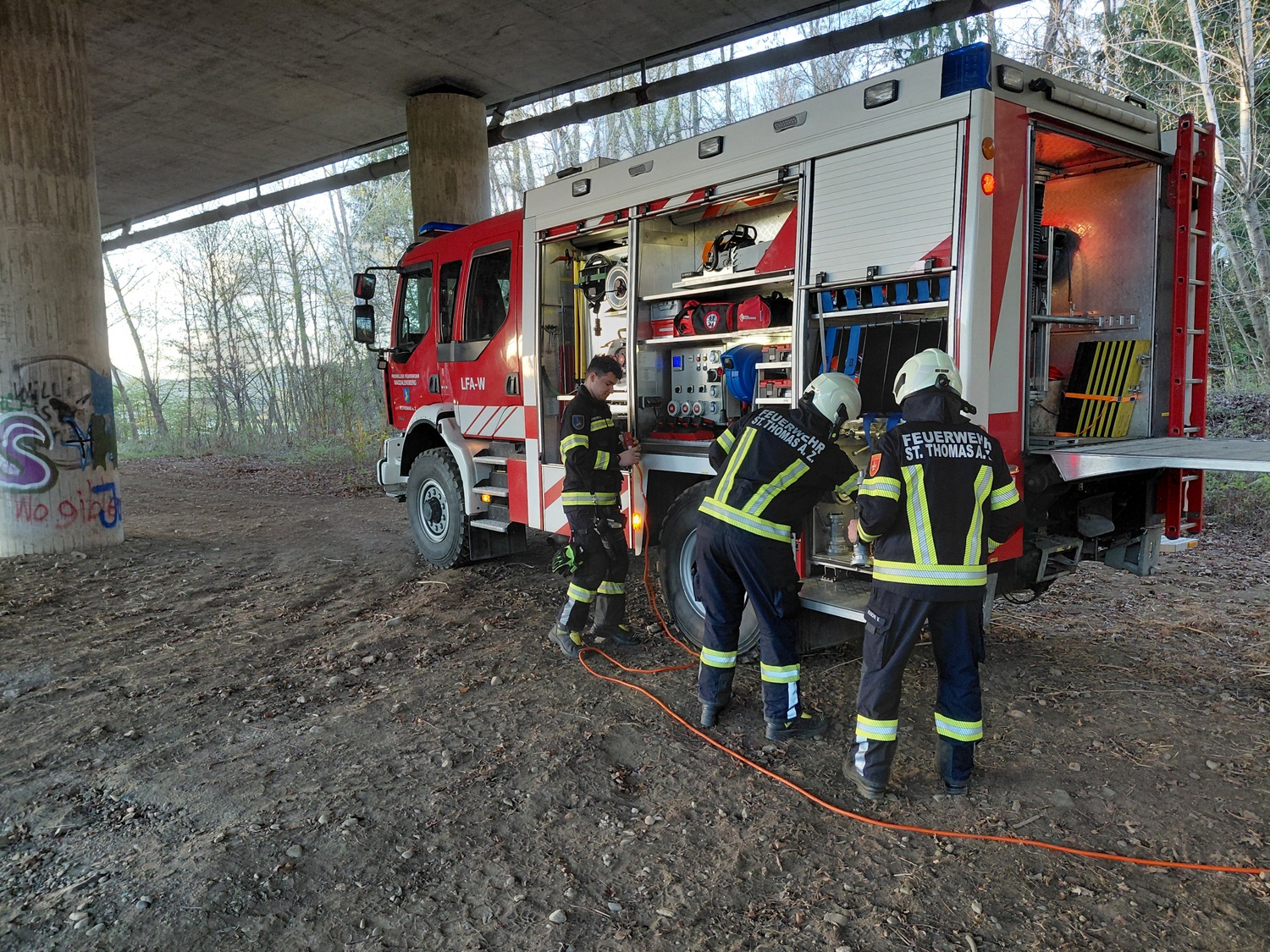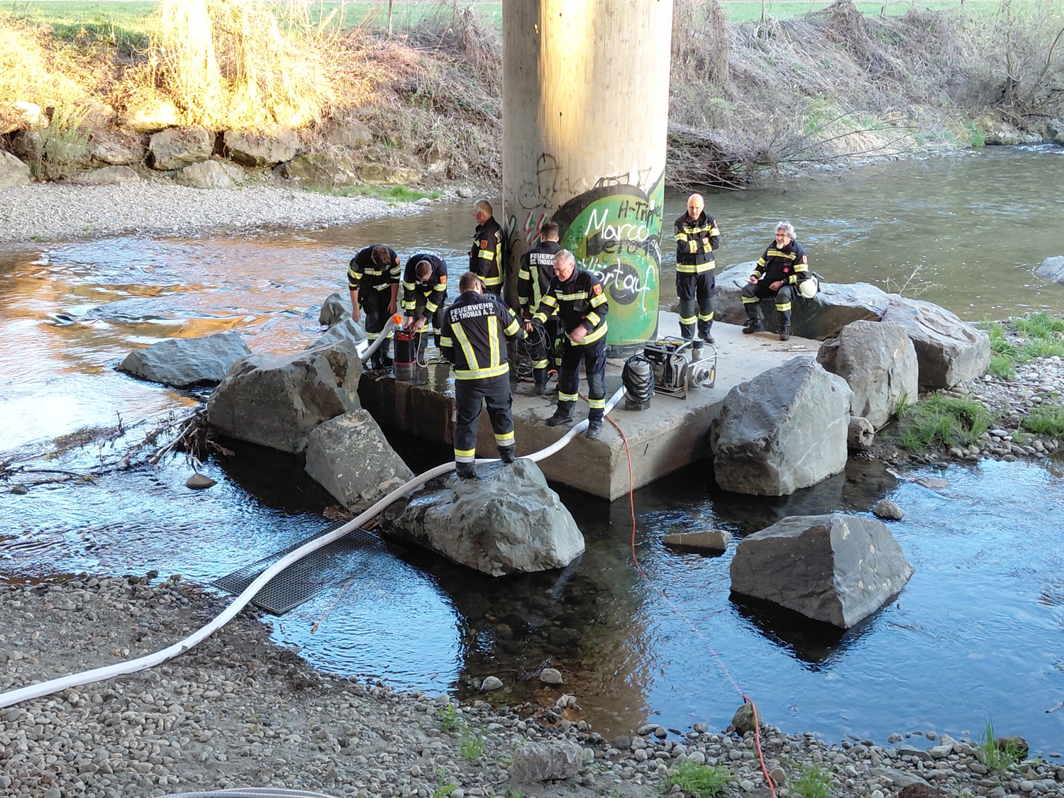 Am Donnerstag, den 09.04.2026 fand unsere Übung mit dem Thema Pumpenkunde und Maschinistentätigkeiten im Rahmen einer Schulung unter der Autobahnbrücke bei der Gurkquerung der Südautobahn (A2) statt.